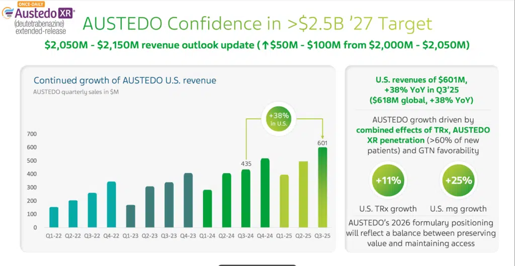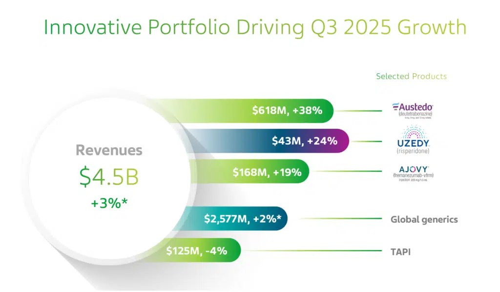 Med frygt for at gentage os selv fra november rapporten, så er det fortsat generika-porteføljen, der driver størstedelen af indtægterne i Teva. Dog leverer Austedo, fra den innovative-produktportefølje, massive indtægter allerede nu på mellem USD 0,6 mia. og USD 0,8 mia.